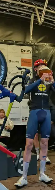 Tim Declercq heeft vandaag in Hooglede het afscheidscriterium gereden. Hij stopt met koersen en mocht in Hooglede zijn fiets aan de haak hangen. Hij won immers deze namiddag. Na de wedstrijd mocht hij genieten van een heerlijk Kwaremont bier van Brouwerij De Brabandere. Hij werd na zijn wedstrijd gehuldigd door de gemeente.